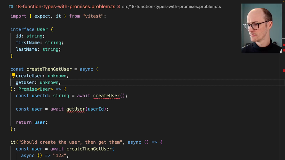 0:00 Let's go deeper into function types here. We've got a function which is createThenGetUser. It takes in a createUser function which is asynchronous. It returns a promise, and it returns a promise including a string. Then, we use that string, which is the userID we've just created from createUser, to get the user. This might be a different database call or something similar.