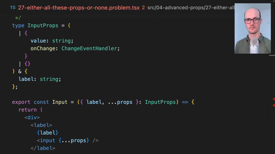 00:00 In this exercise, we have an input component. And this input component is a very standard input component, except we've gotten a bit clever in the prop types. We want to basically have two different states for our components. Either it's going to be a controlled component where we're going to pass in value and onChange,