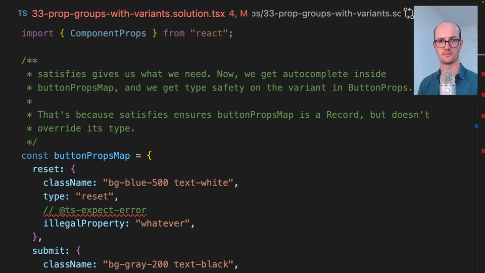 01:13 because now our variant has stopped working. This variant here, key of type of button props map is being inferred as a string, not as reset, submit or next. So this string here, the key inside of record is actually kind of key to understanding this. So we've got this record.