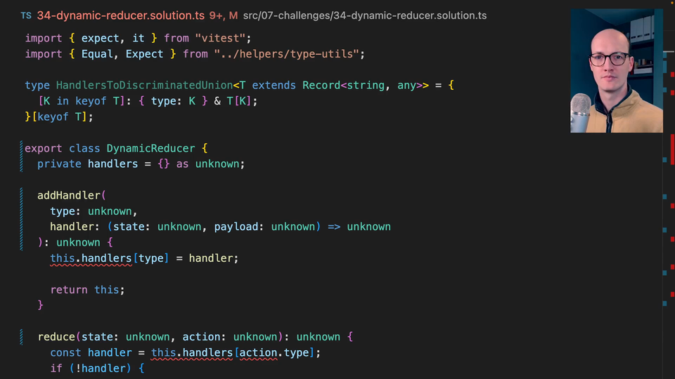 1:34 On the addHandler, we take in a type and this is string basically. Let's say for now that I'm just going to leave this on types, because this is going to get rid of some of the errors down here, because now, reducer, we can see that it actually returns dynamicReducer state because we're returning this, and we're inferring the type of this from what dynamicReducer is.