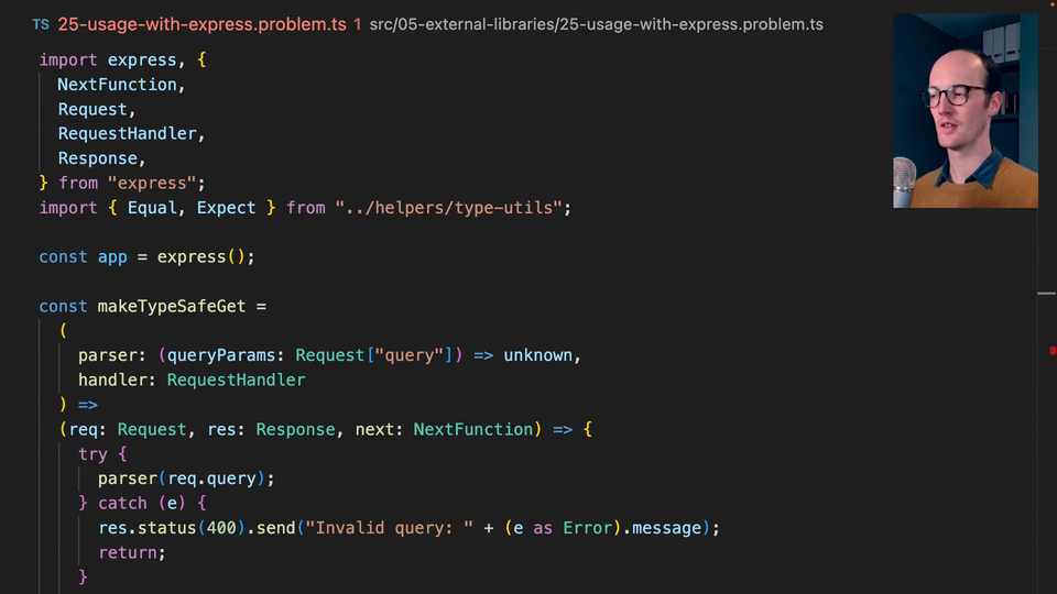 0:00 In this exercise, we're building an Express app. This Express app has a getUser function. The getUser basically says app.getUsergetUser. Now, getUser, what it's going to be, is we're creating this abstraction called makeTypeSafeGet. What we're doing is we have a parser, which we're parsing as the first argument to makeTypeSafeGet. Now we have a query params, which is request query, which we're getting from Express here.