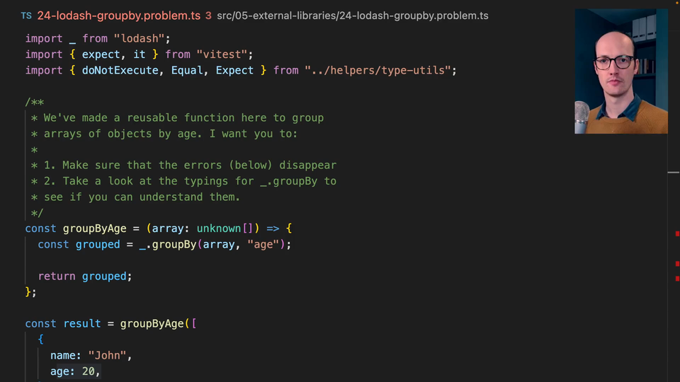 0:00 Knowing what we now know about exploring third-party libraries, let's dive into this groupBy age function, where we're importing something from Lodash, which is this groupBy. We're taking this array, which is currently typed as unknown array. We're grouping it by age.