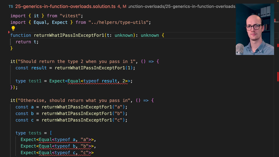 0:44 In this case, when t is not equal to 1, then we're going to just treat it as T and infer it. If you hover over this, then we get the inference here. You notice if we hover over this, there's no type argument being inferred here. What this means is we can use generics on different function overload signatures to map different type argument setups.