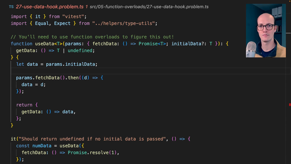 0:57 Your challenge then is to fix this function in order to make that work. There are a couple of solutions to this, but I want you to prioritize the one that uses function overloads here. That's what's going to get you there. By the way, this is based on a real PR that I made to TanStack Query to add this functionality there.