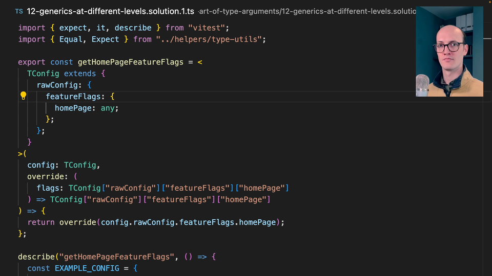 0:32 What that means is that TConfig, then, we can index into it to find the type that the flag should be. We should be able to rawConfig in there, featureFlags, and then home page there.