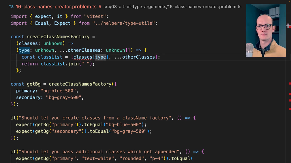 0:52 We shouldn't be able to pass in stuff that isn't in our object here. We shouldn't be able to pass invalid stuff to classNames factory that it can't work out.