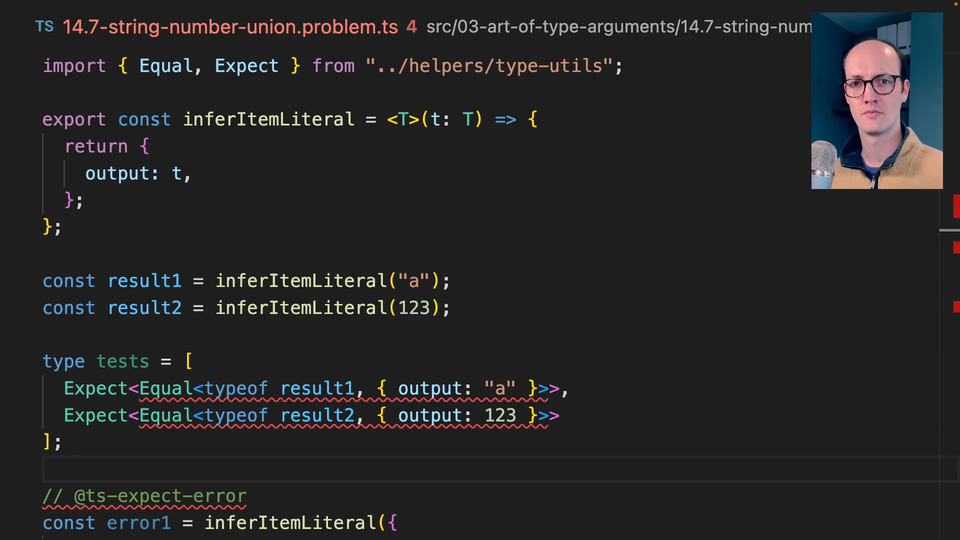 0:00 In this exercise, we have a function called inferItemLiteral. This item literal basically takes in a type parameter of T and returns that T on an object. Now, because it's returning an object, we know that, from the previous explainers, that we're going to have some issues with inference here.