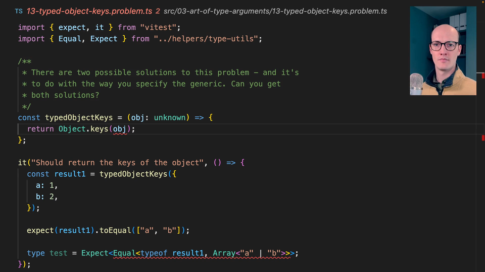 0:00 In this exercise, we have a function called typedObjectKeys where we receive an object, and we want to grab the keys from it and return them. Object.keys by default it returns string here or rather an array of strings. There's a very good reason for that which we can touch on and explain it. I might cover in an article too actually.